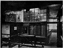Originally the entrance hall was accessed through a pair of sliding doors and a vestibule which was formed by a Van Kannel revolving door. The ladies’ reading room was on the right. The main reading room was further down and entered by swing doors. The remodeled lending library was also accessed from the hall; the existing bookstore and lending library had been turned into one room by removing walls and supporting the overhead rooms on girders. Inside the entrance lobby is a tiled mosaic floor, and the walls have dados of green and dark brown enameled bricks. An ornate cast-iron spiral staircase leads to the first floor former reference library. A secondary staircase from the old town hall was also incorporated into the Carnegie library and a room was provided at the north end of the flat roof, above the reading room, for studying natural history.[22]