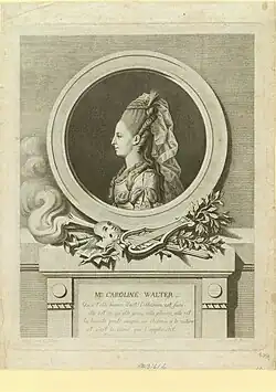 In 1777, general H. H. von Eickstedt became director of the Royal Danish Theatre. von Eickstedt reportedly undermined her position because he wished to benefit the career of his lover, Catharine Frydendahl, and it is noted how he gave the role in Ewalds Fiskerne, which was written for her, to Frydendahl.[5] The conflict culminated when von Eickstedt refused to give Caroline's lover, the German violinist Christian Friedrich Müller (1752-1827), a position in the theater, ordered him exiled from Denmark and delayed Caroline's divorce.[6] Reportedly, the theater direction feared that they would lose her if she married a foreigner. In 1780, not long after Caroline had finally been granted her divorce, Christian Friedrich Müller left Denmark for Sweden, and soon after, Caroline left Denmark in the guise of a man after her performance as Louise in Desertøren and reunited with him in Gothenburg in Sweden, where they married.[7] They had one child, Caroline (1791).