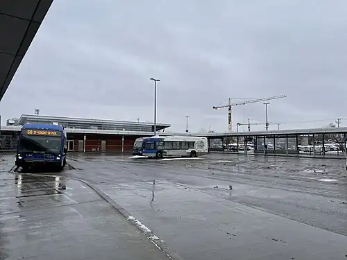 A large bus terminus with 11 platforms and two park and ride lots (599 free spaces[6] ) has been built above the subway station. The covered bus terminal has an Autorité régionale de transport métropolitain (ARTM) ticket counter, a heated waiting area, and electronic boards to display bus departures. In addition, a shopping concourse has been built adjacent to the bus terminal to eventually welcome shops and restaurants. A convenience store and a café are currently the only tenants.