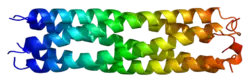 The protein encoded by this gene is a noncollagenous extracellular matrix (ECM) protein.[8] It consists of five identical glycoprotein subunits, each with EGF-like and calcium-binding (thrombospondin-like) domains. Oligomerization results from formation of a five-stranded coiled coil and disulfide bonds. Binding to other ECM proteins such as collagen appears to depend on divalent cations. Mutations can cause the osteochondrodysplasias pseudoachondroplasia (PSACH) and multiple epiphyseal dysplasia (MED).[7]