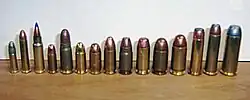 (Left) Three non-bottlenecked cartridges (9×19mm Parabellum, .40 S&W and .45 ACP)