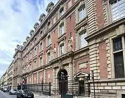 Grisart designed the building in the Louis XIII style.[2] Above each of the two portals are two allegorical statues, sculpted by Louis Desprez.[1]