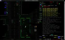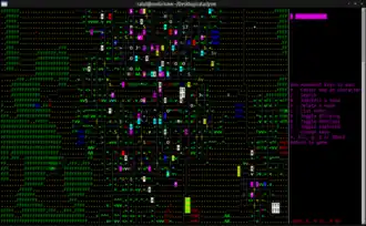 The game is made with ncurses to provide text-based graphics; later a Simple DirectMedia Layer (SDL) version with graphical tiles became available.
