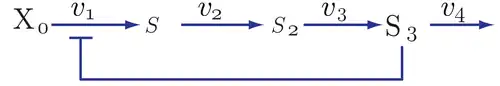To make the notation manageable, a specific numbering scheme is used in the following patterns. If a substrate has an index of , then the reaction index will be . The product elasticity will also have an index of . This means that a product elasticity will have identical subscripts and superscripts making them easy to identify. The source boundary species is always labeled zero as well as the label for the first reaction.