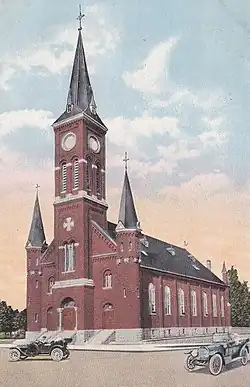 The Gothic-style church burned to the ground in 1920 and construction of the present church building started in 1922. When the basement was completed, Mass was held there until construction on the upper church ended in 1931. The church was designed after the sixth-century Basilica of Sant'Apollinare in Classe in Ravenna, Italy.[2] The parish's pastor, Luke Fink, OSB, attended a Eucharistic Congress in Italy and was inspired by the architecture there. He relayed his plans to a local architect, Nairne W. Fisher, who designed the upper building.[1]