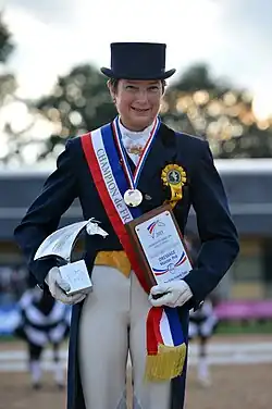 Catherine Durand-Henriquet is a French equestrian. She was twice selected for the Equestrian at the Summer Olympics. She brought the first Iberian horse to International and Olympic levels[1] and was also the first rider in the Versailles tradition to ever ride in the Olympic Games. She was national dressage champion multiple times. Together with her husband, famous equestrian and dressage master Michel Henriquet, she wrote a number of major dressage and horse training books and released a young horse training DVD series showing how the Henriquets take young horses from their first time under the saddle to the Grand Prix. Catherine Henriquet still actively shows Hanoverian horses and Lusitano horses at Grand Prix level and has trained dozens of horses to the Grand Prix. She currently rides two horses on the Big Tour: 18.7 hands Hanoverian gelding Lexus Gold and 15.7 hands Lusitano gelding Diabeau du Coussoul. Henriquet is also a retired dermatologist and always maintained professional practice while showing internationally. Having a full time profession aside from riding sometimes got in the way of being able to attend international shows and selections.