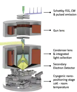 The primary advantages to the electron microscope based technique is its spatial resolution. In a scanning electron microscope, the attainable resolution is on the order of a few ten nanometers,[3] while in a (scanning) transmission electron microscope (TEM), nanometer-sized features can be resolved.[4] Additionally, it is possible to perform nanosecond- to picosecond-level time-resolved measurements if the electron beam can be "chopped" into nano- or pico-second pulses by a beam-blanker or with a pulsed electron source. These advanced techniques are useful for examining low-dimensional semiconductor structures, such a quantum wells or quantum dots.