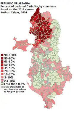 According to the 2011 Albanian census, 10.03% of the population affiliated with Catholicism, while 56.7% were Muslims, 13.79% undeclared, 6.75% Orthodox believers, 5.49% other, 2.5% Atheists, 2.09% Bektashis and 0.14% other Christians.[9]