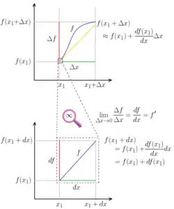 In the top graph we see approximation of function (blue line) using a finite difference (yellow line). In the bottom graph we see "infinitely many times enlarged neighborhood of point " (purple square from the upper graph). In the bottom graph, the yellow line is completely covered by the blue one, thus not visible. In the bottom figure, two equivalent derivative forms have been used: ], and the designation was used.