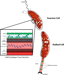 C. crescentus derives its name from its crescent shape, which is caused by the protein crescentin. It is an interesting organism to study because it inhabits nutrient-poor aquatic environments. Their ability to thrive in low levels of nutrients is facilitated by its dimorphic developmental cycle. The swarmer cell has a flagellum that protrudes from a single pole and is unable to initiate DNA replication unless differentiated into a stalked cell. The differentiation process includes a morphological transition characterized by ejection of its flagellum and growth of a stalk at the same pole. Stalked cells can elongate and replicate their DNA while growing a flagellum at the opposite pole, giving rise to a pre-divisional cell. Although the precise function of stalks is still being investigated, it is likely that the stalks are involved in the uptake of nutrients in nutrient-limited conditions.[2] Its use as a model originated with developmental biologist Lucy Shapiro.[3][4]