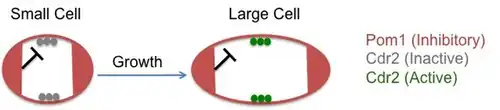 Pom1 is distributed in a gradient from the cell tips, with the maximum concentration in the cell tips and the lower concentrations in the medial region of the cell, roughly overlapping with the wide medial band occupied by Cdr2. In small cells, there is a higher level of overlap between Pom1 and Cdr2, leading to a greater degree of inhibition of Cdr2; conversely Cdr2 is unable to inhibit Wee1, which is then free to inhibit CDK1. Therefore, Cdr2 functions as part of a cell-size sensor pathway. In larger cells, there is much lower degree of overlap between Pom1 and Cdr2, allowing Cdr2 to inhibit Wee1; CDK1 is then able to promote mitotic entry.