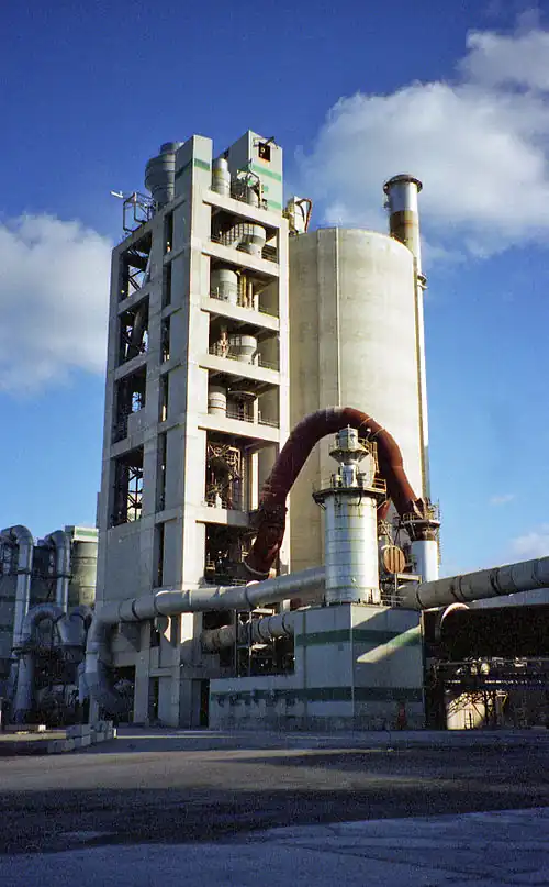 Emissions from cement kilns are a major source of greenhouse gas emissions, accounting for around 2.5% of non-natural carbon emissions worldwide.[2] The emissions come from two sources: the fuel and the waste CO2 created from heating the silicate rocks. Conventional cement kilns burn fossil fuels or alternative fuels like tire waste, agricultural waste or other wastes, as a form of waste valorization. Because of the need to reduce emissions to mitigate climate change, multiple companies are investing in alternative fuel sources, including investigations of hydrogen or electricity based heating.[3][4] Other mitigation approaches, include capturing carbon dioxide from the process at the exhaust stage of the kiln, and reducing use of clinker in final mix of concretes.