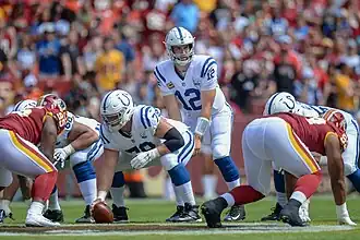 The center's first role is to pass the football to the quarterback. This exchange is called a snap. Most offensive schemes make adjustments based on how the defensive line and linebackers align themselves in relation to the offensive line, and what gaps they line up in. Because the center has an ideal view of the defensive formation before the snap, they typically make the first line call. This call is typically based on the position of the defensive linemen or linebackers in their gaps (0i-1i), most subsequent adjustments are dependent on this call. In some cases, the center may call an adjustment for the entire offensive line. This was taken to an extreme by the Indianapolis Colts in the early 21st century, with center Jeff Saturday having equal say with quarterback Peyton Manning in play calling, including audibles.[1] The center is therefore usually the most intelligent player on the offensive line.