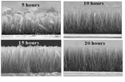 The center has been studying the hydrothermal growth process of ZnO nanorods for the last few years. A typical process was carried out in a sealed chemical bath containing an equimolar solution of zinc nitrate hexahydrate and hexamethylene tetramine at a temperature of 95 °C for a period of up to 20 hours. The thickness and length of the nanowires can be controlled by using different concentrations of the starting reactants and growth durations. A 0.5 mM chemical bath yielded nanowires with an average diameter of around 50 nm, while a 25 mM bath resulted in wires with a thickness of up to about 1μm. The length of the wires depends both on the concentration of the precursor solution as well as the growth duration, and in 20 hours, nanowires as long as 10 μm can be grown.