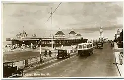 The Central Bandstand with its 1932 frontage has been described as an Art Deco landmark, and one of the first reinforced concrete structures in the UK.[2][3] It straddles the beach and Central Parade just east of the Clock Tower. The back or seaward half, built in 1924, was originally supported above the beach on concrete pillars sheathed in cast iron, so that the stage was level with the main thoroughfare.[4] The tide used to go in and out under the building until at least the 1950s. During World War II when the Pier was out of bounds, anglers were permitted to fish from the rooftop balcony.[5] As of 2013 the beach has risen so that the piers are no longer visible and the sea has receded away from the Bandstand.