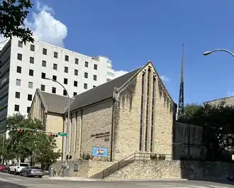 The congregation traces its roots to October 13, 1839, when Austin's first Presbyterian worship service was held at Bullock's hotel. The City of Austin was chartered two and a half months later, December 27, 1839. Present at that service was builder Abner Cook, elder in the first Presbyterian church organized in Austin.[1] He helped acquire the property at the northeast corner of Brazos and Bois d'Arc (now Eighth Street) for the Presbyterian Church (South) following a post-Civil War split in the church. A sanctuary was completed on the site in 1874; the current sanctuary was built in 1957. It was recognized by the Texas Historical Commission in 1989 as an historical site.