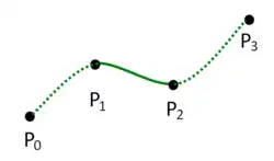 In computer graphics, the centripetal Catmull–Rom spline is a variant form of the Catmull–Rom spline, originally formulated by Edwin Catmull and Raphael Rom,[1] which can be evaluated using a recursive algorithm proposed by Barry and Goldman.[2] It is a type of interpolating spline (a curve that goes through its control points) defined by four control points , with the curve drawn only from to .
