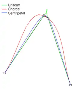 in which ranges from 0 to 1 for knot parameterization, and with . For centripetal Catmull–Rom spline, the value of is . When , the resulting curve is the standard uniform Catmull–Rom spline; when , the result is a chordal Catmull–Rom spline.