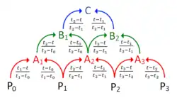 A3 = (t3 - t) / (t3 - t2) * P2 + (t - t2) / (t3 - t2) * P3