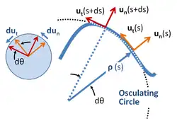Local coordinate system for planar motion on a curve. Two different positions are shown for distances s and s + ds along the curve. At each position s, unit vector un points along the outward normal to the curve and unit vector ut is tangential to the path. The radius of curvature of the path is ρ as found from the rate of rotation of the tangent to the curve with respect to arc length, and is the radius of the osculating circle at position s. The unit circle on the left shows the rotation of the unit vectors with s.