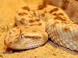 Cerastes is a genus of small vipers found in the deserts and semi-deserts of northern North Africa eastward through Arabia and Iran.[2][3] Three species are currently recognized by ITIS,[4] and an additional recently described species is recognized by the Reptile Database.[5] Common names for members the genus include horned vipers,[6] North African desert vipers,[3] and cerastes vipers.[7]