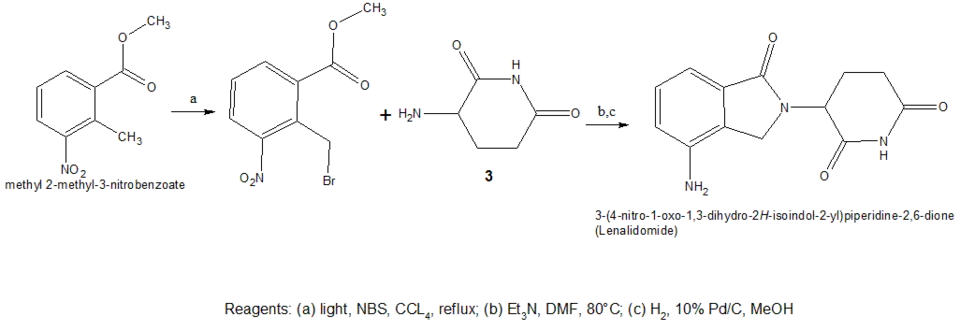 Lenalidomide is synthesized in a similar way using compound 3 (3-aminopiperidine-2,6-dione) treated with a nitro-substituted methyl 2-(bromomethyl) benzoate, and hydrogenation of the nitro group.[44]