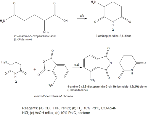 Both of the amino analogs are prepared from the condensation of 3-aminopiperidine-2,6-dione hydrochloride (Compound 3) which is synthesized in a two step reaction from commercially available Cbz-L-glutamine. The Cbz-L-glutamine is treated with CDI in refluxing THF to yield Cbz-aminoglutarimide. To remove the Cbz protecting group hydrogenolysis, under 50–60 psi of hydrogen with 10% Pd/C mixed with ethyl acetate and HCl, was performed. The formulated hydrochloride (Compound 3 in Scheme 3) was then reacted with 3-nitrophthalic anhydride in refluxing acetic acid to yield the 4-nitro substituted thalidomide analog and the nitro group then reduced with hydrogenation to give pomalidomide.[44]