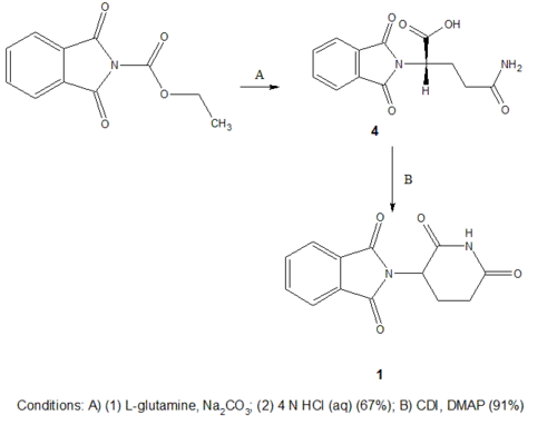 Scheme 2 is the newer synthesis route which was designed to make the reaction more direct and to produce better yields. This route uses L-glutamine rather than L-glutamic acid as a starting material and by letting it react with N-carbethoxyphthalimide gives N-phthaloyl-L-glutamine (4), with 50–70% yield. The substance 4 is then stirred in a mixture with carbonyldiimidazole (CDI) with enough 4-dimethylaminopyridine (DMAP) in tetrahydrofuran (THF) to catalyze the reaction and heated to reflux for 15–18 hours. During the reflux thalidomide crystallizes out of the mixture. The final step gives 85–93% yield of thalidomide, bringing the total yield to 43–63%.[46]