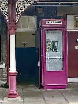 On the up, south-bound, platform there is one of the few surviving K8 telephone kiosks. Now used for the TfL internal system, the kiosk is Grade II listed[9]