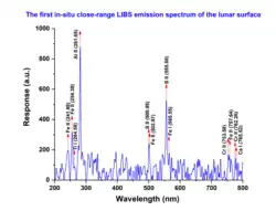 - Laser-induced breakdown spectroscopy (LIBS) will determine the elemental composition (Mg, Al, Si, K, Ca, Ti, Fe) of lunar soil and rocks around the lunar landing site.[40]