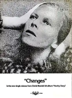 Retrospectively, "Changes" is described by Bowie's biographers as a manifesto of his entire career.[4][21][44] Throughout the 1970s, Bowie changed his musical styles and appearances constantly; Doggett notes that each album he released between 1974 and 1977—Diamond Dogs, Young Americans, Station to Station and Low—could not have predicted the next.[21] He was dubbed the "chameleon of rock" by numerous publications and biographers due to his constant reinvention throughout his career,[58][59] which matches the overall theme in "Changes".[21] Buckley notes that 1971 was a pivotal year for Bowie; it was the year in which he became "something of a pop-art agent provocateur.[20] In a time when rock musicians looked to traditions and established standards, Bowie looked to be radically different and challenge tradition, reinventing himself again and again, thereby creating new standards and conventions.[20][58] Doggett also notes that "Changes" is a "statement of purpose": it was the first track on Hunky Dory, the first time his audience had heard of him since The Man Who Sold the World (1970), and his previous hard rock and metallic sound was not present. Furthermore, he states that the song was unlike "Space Oddity" and its parent album, but rather "pure, unashamedly melodic, gleefully commercial, gorgeously mellifluous pop."[21]