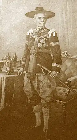 He was then finally promoted to a full general on April 1, 1919.[13] Later on, he became acting Minister of Defense on August 26, 1921, and was appointed as minister April 1, 1922. On November 11, 1922, he was given the title of Chaophraya Bodindechanuchit with a sakdina of 10,000.[14] He was a member of Vajiravudh's paramilitary movement the Wild Tiger Corps, and received the rank of major on February 15, 1923.[15]