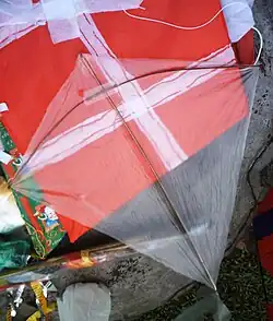 This kite, with a simple two-point bridle, has moderate lateral roll and flutter (oscillation), that some kite fliers prefer in kite fighting, over stable, quiet flight. Unlike the diamond-shaped Malay kite[1] and Eddy,[2] no extra strings are used in the edges for the frame, making the chapi-chapi easier and faster to assemble but relatively more fragile. The chapi-chapi is quite similar but not identical to the Thai "female" kite called pakpao,[3] to the Patang or Indian fighter kite,[4] and to the Nagasaki Hata or Matt Star fighter kite.[2][5]