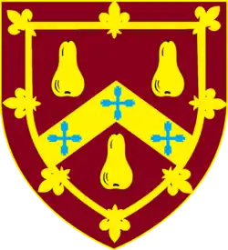 Gules, on a chevron between three pears Or as many crosses raguly Azure within a tressure flory of the second.