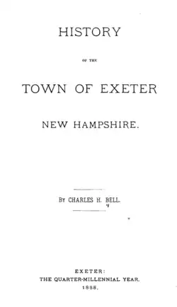 Bell was the author of an influential early history of Exeter, New Hampshire, as well as a number of other books.[3] His first wife was Sarah Almira Gilman, daughter of Nicholas Gilman; his second wife Helen A. (Williams) daughter of Reuel Williams of Portland, ME, and widow of John Taylor Gilman of Exeter. Both wives were descendants of Edward Gilman Sr., an early Exeter settler who had previously lived in Hingham, Massachusetts, and Ipswich, Massachusetts.
