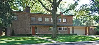 The Koebel House is a two-story, 5600 square-foot Modernist structure built from tan brick, with five bedrooms and a flat roof[3] located on a corner lot.[2] The house is essentially rectangular in plan, with the addition of a curved, projecting sun porch on the southwest corner.[2]