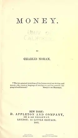 - Moran, Charles (1863). Money. New York: D. Appleton and Company – via Internet Archive.