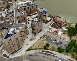 In September 2006, the one-way system was abandoned and two-way traffic reintroduced on most of the ring-road system.[27] Further work on the road system commenced early in 2009, and as of early 2010, the demolition of the Sir John Hawkins Flyover has been completed. It was replaced by a street-level, buses only, road coupled with repositioning of the bus station. The new Waterfront bus station opened in October 2011.[28]