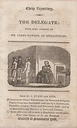 The individual tracts have a complex bibliographical history often going through many editions and involving several different individuals who were designated 'Printer to the Cheap Repository,' together with many distributors and publishers. Retail sales were made by 'booksellers, newsmen, and hawkers, in town and country.'[7] The most important printers involved were Samuel Hazard of Bath; John Marshall of London, William Watson of Dublin; and John Evans of 42 Long Lane, London. Several tracts were also reprinted in the US by printers in both New York and Philadelphia. Until the end of 1798 the publisher undertaking the work was 'The Cheap Repository', but thereafter the copyrights of the official tracts were sold and later collected editions were published by John and James Rivington for the Society for Promoting Christian Knowledge (S.P.C.K.).