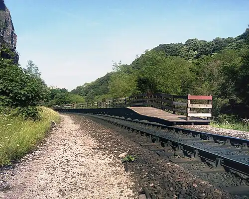 ![]() Chee Dale Halt in 1989. Note that the station signs were still present two years after closure. | |||||