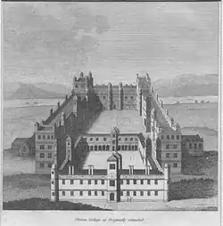 The scheme ultimately proved to be a failure. In consequence of a letter addressed by the king to Archbishop George Abbot, collections in aid of the institution were made in all the dioceses of England, but the amount raised was small, and hardly covered fees due to the collectors. After Sutcliffe's death the college sank into insignificance, and Charles I in 1636 refused to revive the moribund institution.[10] William Laud thought of it as "controversy college", and he disliked public disputation as divisive.[11] An engraving representing the building project, which was only very partially carried through, is in the second volume of Francis Grose's Military Antiquities (1788).[1][12]