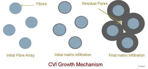 The CVI growth mechanism is shown in Figure 2. Here, as the reaction between fibre surface and the matrix material takes place, a coating of matrix is formed on the fibre surface while the fibre diameter decreases. The unreacted reactants along with gases exit the reactor via outlet system and are transferred to an effluent treatment plant.[5]