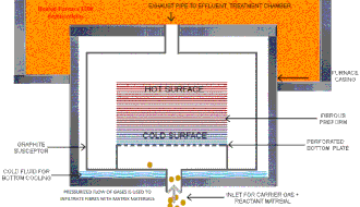 A typical demonstration of the process is shown in Figure 1. Here, the gases and matrix material enter the reactor from the feed system at the bottom of the reactor. The fibrous preform undergoes a chemical reaction at high temperature with the matrix material and thus the latter infiltrates in the fiber or preform crevices.