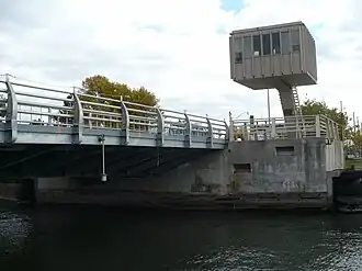 The City solicited a bid for the first swing bridge in 1896.[1] Contractors were allowed to propose either a metal or wood bridge. The Privy Council of Canada approved funding of the bridge in 1900.[2] The two spans were 52 feet (15.85 m) long, which was considered sufficient to accommodate navigation on the river." The wooden bridge was replaced by steel draw bridges in 1912 and 1932.[3]