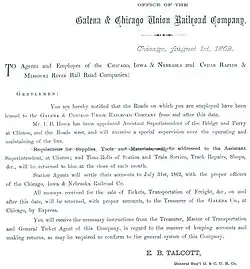 - ^ "Railroads". The Chicago Republican. Chicago, IL. November 14, 1867. p. 2.
