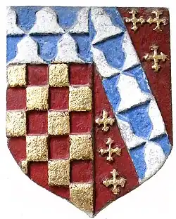 The arms of Raleigh are: Gules crusilly or, a bend vair, and are also shown as the second quartering of ten on an escutcheon on top of the monument. By marriage to the Raleigh heiress in the 14th century the Chichester family acquired the manor of Raleigh in the parish of Pilton, and many others. These arms are also those blazoned for "Henri de Ralle" on the following mediaeval rolls of arms: Dering Roll (185), St George's Roll (E406), Heralds' Roll (HE317), Charles' Roll (F207).[14][15]