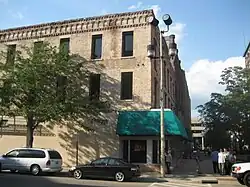 The Chick House's design is simple and utilitarian, reflecting its construction for use as a hotel. The three-story brick structure's 66 foot (20.1 m) east facade faces Main Street and its 149-foot (45.4 m) south facade faces toward Elm Street. The building incorporates elements from Greek Revival and Italianate styles and presents itself as an architectural "antithesis" to the adjacent Richardson Romanesque Stewart Building.[3] The Chick House originally has an "L" shape but additions during the 1890s, 1900s and in 1932 partially filled in the rear of the building, which faces toward an alley.[3]
