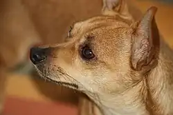 Chihuahua breed standards specify an "apple-head" or "apple-dome" skull conformation.[13] Chihuahuas occur in virtually any color combination, from solid to marked or splashed.[14] Apple-dome Chihuahuas have large, round eyes and large, erect ears, set in a high, dramatically rounded skull.[15] The stop is well defined, forming a near-90-degree angle where the muzzle meets the skull.[3] Dogs of the older "deer" type, with a flat-topped head, more widely set eyes, larger ears, and longer, more slender legs, may still be registered, but the deer head is not considered a separate type in competition and a deer-head dog's digression from the breed standard is considered a fault.[13][3]