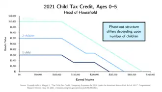 - ^ a b c Crandall-Hollick, Margot L. (May 12, 2021). "The Child Tax Credit: Temporary Expansion for 2021 Under the American Rescue Plan Act of 2021 (ARPA; P.L. 117-2)". Congressional Research Service. Archived from the original on November 9, 2021. Retrieved November 11, 2021.