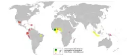In the 2018–2019 growing year (which runs October through September),[62] 4.78 hundred thousand tonnes of cocoa beans were produced. African nations produced 2.45 million tonnes (69%), Asia and Oceania 0.61 million tonnes (17%) and the Americas 0.48 million tonnes (14%).[3] Two African nations, Côte d'Ivoire and Ghana, produce more than half of the world's cocoa, with 1.23 and 0.73 million tonnes respectively (35% and 21%, respectively).[3]